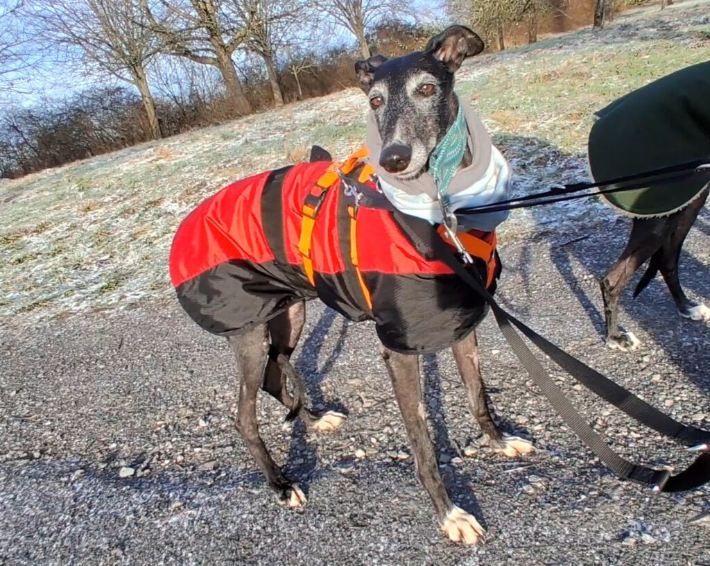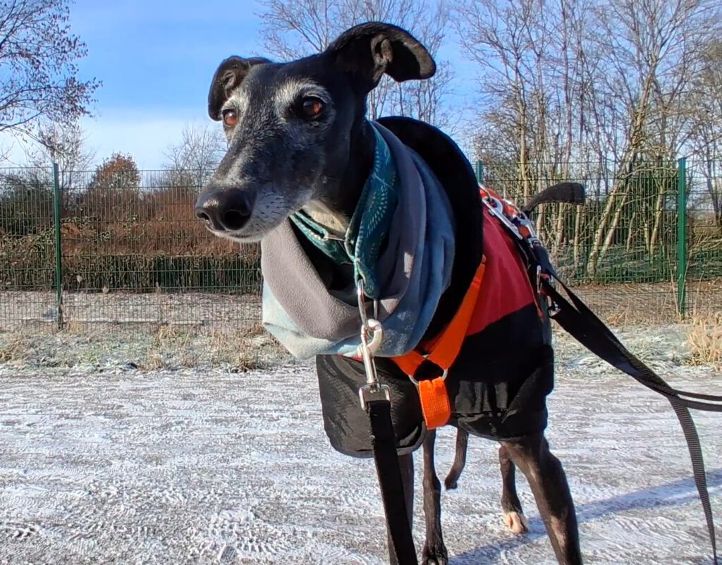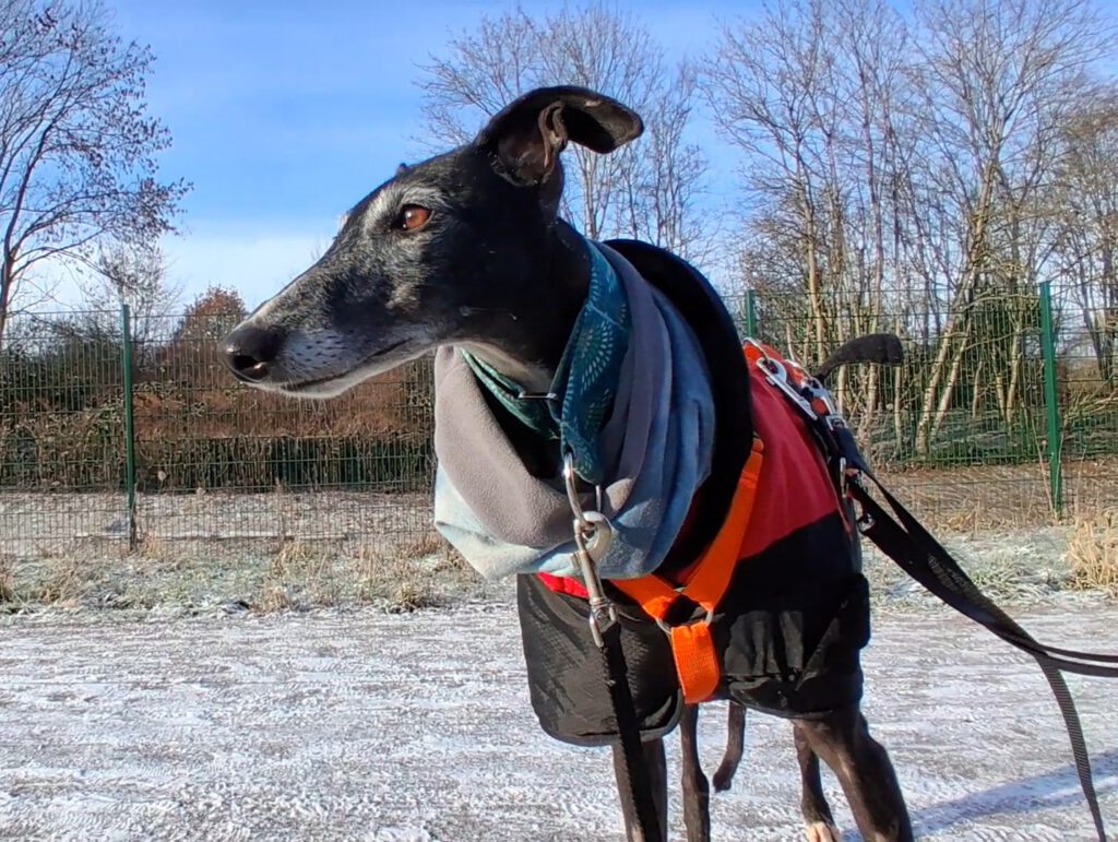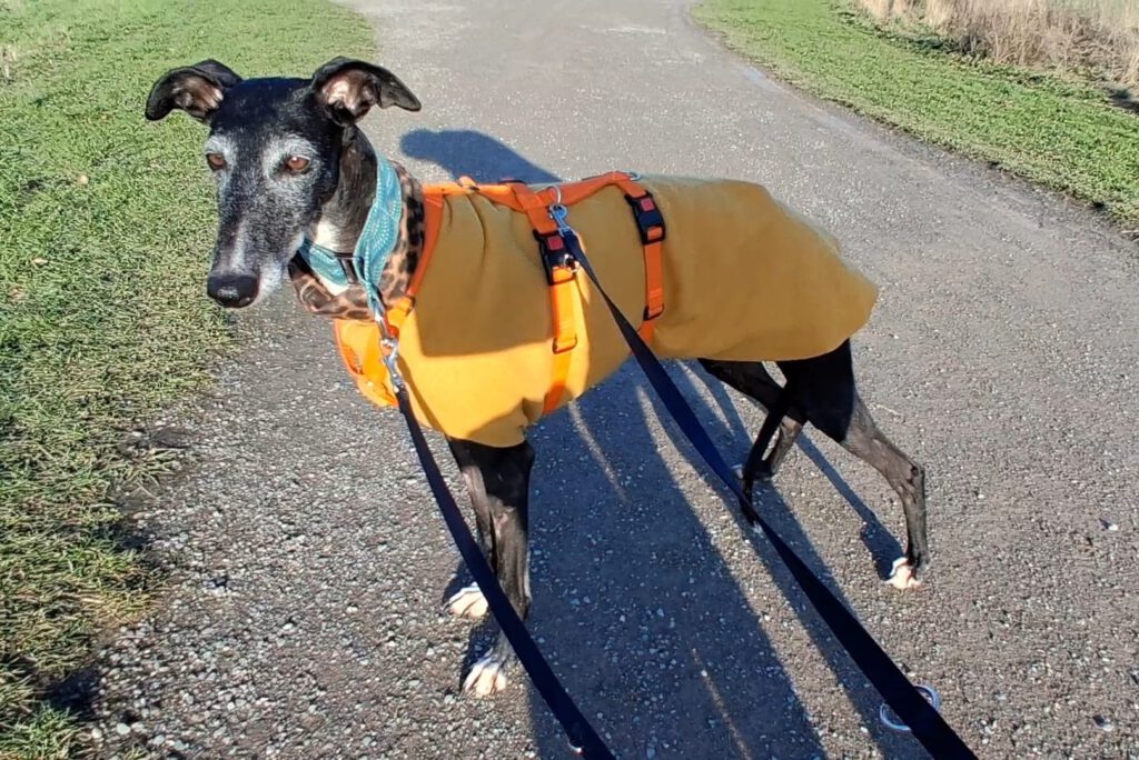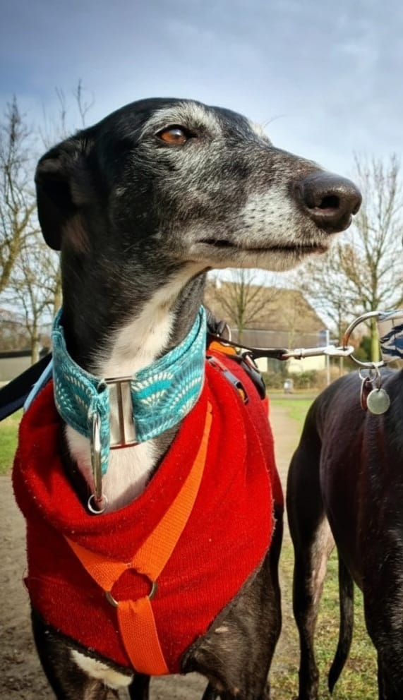 An der Leine läuft sie mittlerweile wunderbar, orientiert sich an ihrem Menschen und ihren Gassi Partnern.