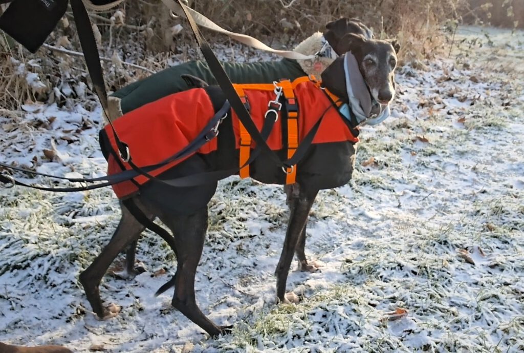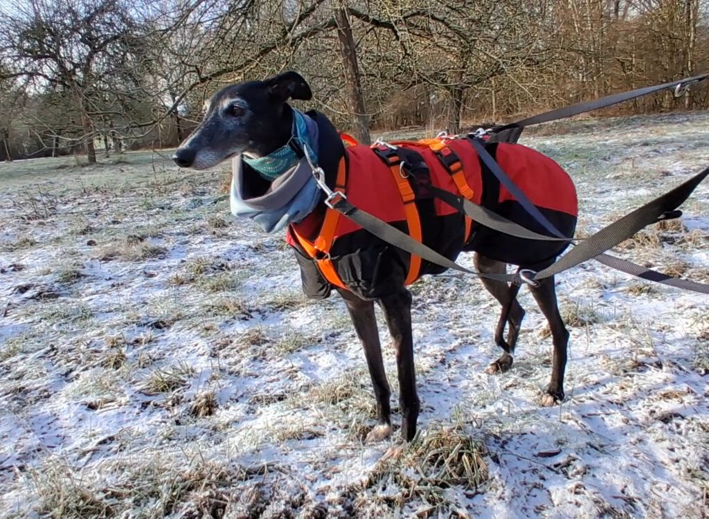 Einige Fasane und Hasen kreutzten ihren Weg, welche sie neugierig beobachtet. Sie bleibt kurz stehen und lässt sich von ihrem Menschen ruhig weiterführen.